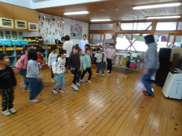 今日は年長のほし組・つき組で、幼児教育学科の市川先生に「英語あそび」をしていただきました。まずはウォーミングアップ。先生が動きを英語でおっしゃいました。「run!」