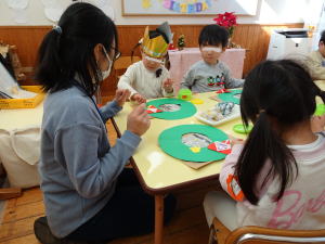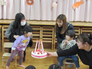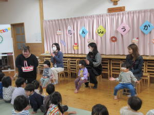 保育棟のクラス全員集まってランチルームでお祝い会をしました。