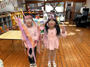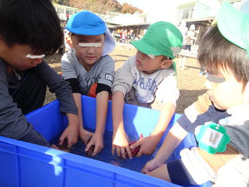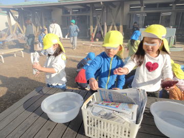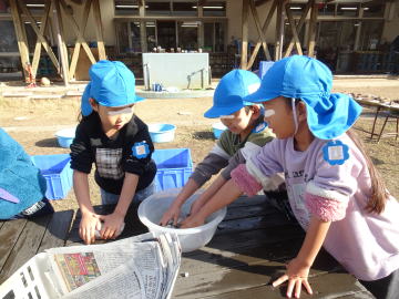 先に終わった園児が後から始めた園児に上手にアドバイスをしていました。