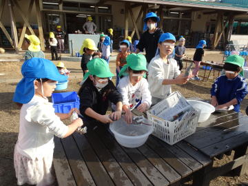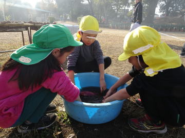 下準備は年長さんの仕事です。まず芋を洗って泥を落とします。