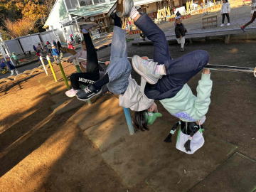 年長さんに「来て。来て。」と言われて行ってみたところ三人並んでの逆上がりを披露してくれました。日々練習の賜物ですね。