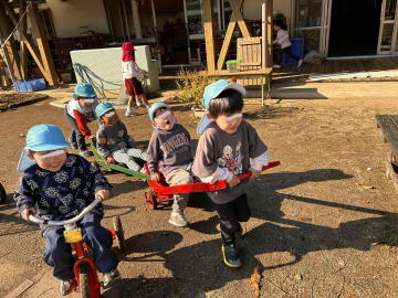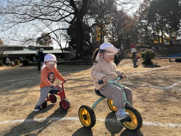 年中さんは引き車と三輪車で並んで園庭を回っていました。進み方も速い。