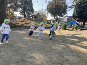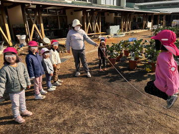 年中さんが長縄跳びをしていました。先生が回しているタイミングを見計らって、上手に中に入れるようになっていました。