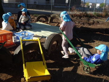病院屋さんでした。引き車は救急車の役割のようです。患者さんを病院に運んできました。先ほどタイヤの上にいた園児もどうやら救急隊の人のようです。