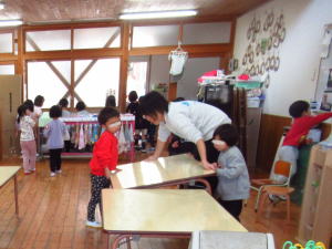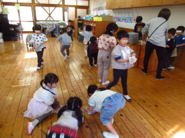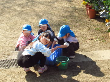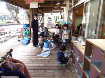 外の遊具等を拭いてくれた年長さん。お湯に手を入れてほっと一息といった様子でした。