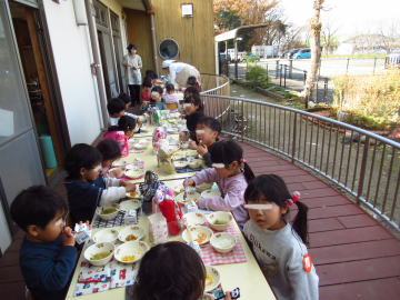 年少さんがデッキで2学期最後の給食を食べていました。