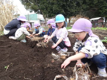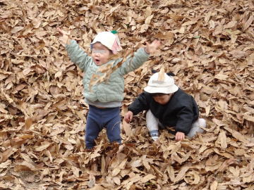 保育棟と築山の間にはクヌギの落ち葉が積もっていて、園児にとって最高の遊び場所になっています。