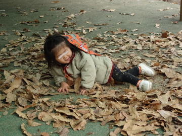 落ち葉の中に埋もれるもよし、頭にかけるもよし。