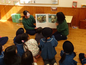 こども教育学部の学生さんが絵本の読み聞かせなどを年少以上の各クラスにしてくれました。あるクラスの絵本は火曜日の観劇会で見た「てぶくろ」でした。劇で見た内容ですので特に興味津々でした。