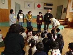 年中さんは祖父母の方々との交流でしたが、年長さんは校区の南八久保の老人会の方々との交流です。