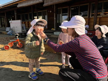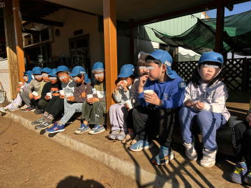 ぱんだ組さんが食べているのは、採ってきたキンカンです。