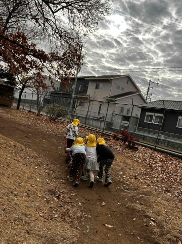 16日(金) 朝寒い中、引き車を押す年長さん。座席に交代交代乗るのでしょうか。