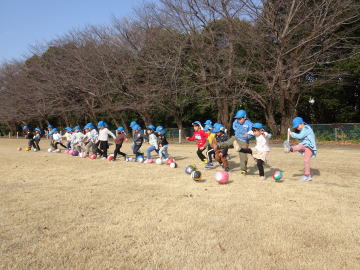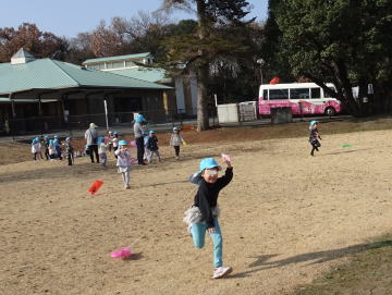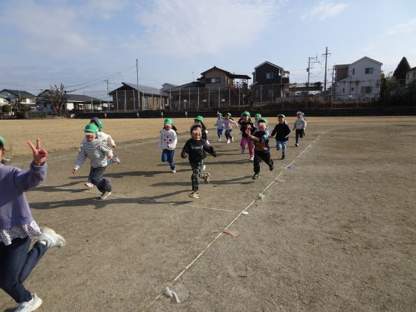 今日から寒さに負けず元気に過ごすために「しっかりあそぼうタイム」が始まりました。園庭やグラウンドに音楽が流れて運動したい気分が高まってきます。築山の回りを走る年少さん。