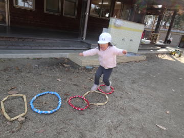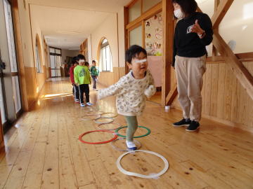お部屋の中でも「ケンケンパ」年少さんはいくつかのクラスを回って楽しむアスレチックコースができていました。