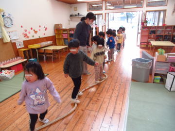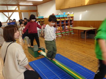 年中さんになると、綱渡りが平均台渡りと発展します。