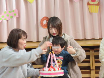保育棟では年齢の数のろうそくの灯を消したり、