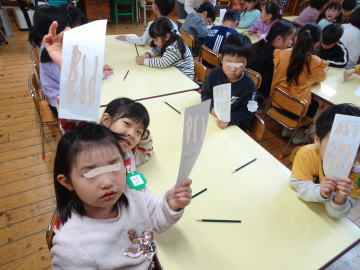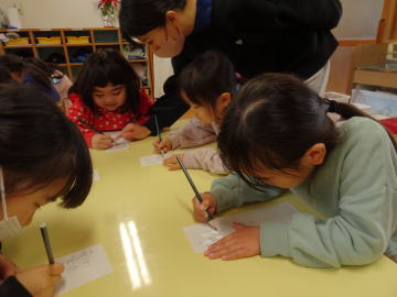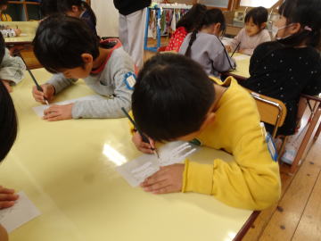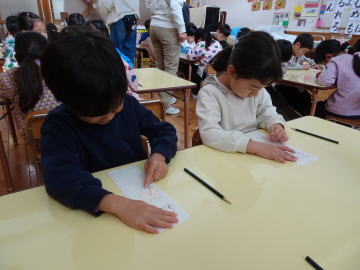 「ぼくのひらがなはこれだよ。」と選ぶ園児もいました。先生が「自分の名前を書いてみましょう。」とおっしゃいました。