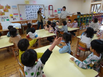 先週、竹下先生を講師にお呼びし「ことば遊び」を行いました。今回は小学校を前にして、自分の名前を書いてみることがねらいでした。まず絵本の読み聞かせがあり、その後ひらがな一覧表を示されました。そして「自分の名前に入っているひらがなはありますか?」と尋ねられ、「あ」から順々に尋ねていかれました。「〝や”が名前にある人?」