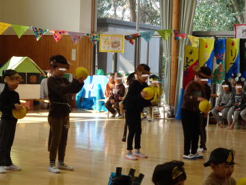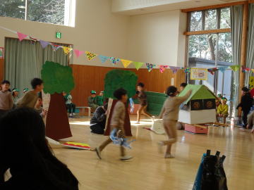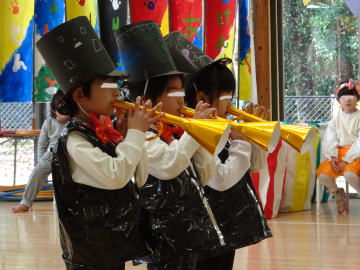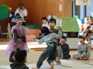 先週木曜日年長組3クラス合同の生活発表会が遊戯室で行われました。