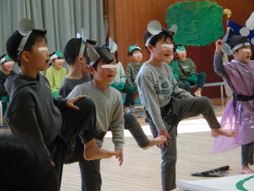 これまでこども園でたくさん遊んできた子どもたち。いろいろな遊びに挑戦して、「見てみて!!」といつも楽しいことやできるようになったことがあると、見せてくれています。今回の劇では、動物になりきって好きなこと得意なことをサーカスのショーとして披露します。必要なものを考えて作る、役になりきって動く等、子どもたちは、劇を作り上げていく過程で様々な経験を積み重ねてきました。・・・自分のもっている力を発揮し、みんなで協力して表現します。