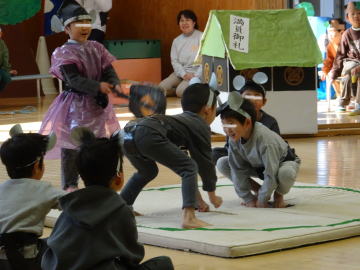相撲の取り組みも行いました。行司さんが「〇〇のやま~」「みあってみあって。はっけよい。」と大きな声で仕切りました。