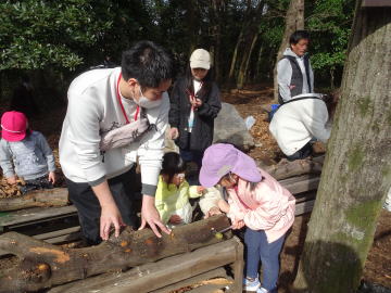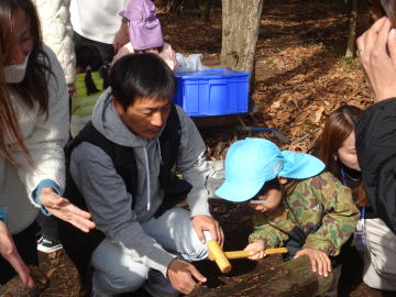 年中さんは登園して、まずたぬきの森で椎茸の菌打ちをしました。