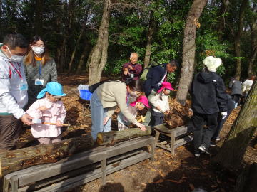 園児が打った菌は2年後椎茸になります。ということはもうすでに小学生になっています。収穫するしいたけは卒園児が打ってくれた物です。世代が変わっても引き継がれていくのですね。
