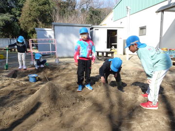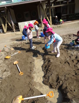 年長さんの遊ぶ姿を見られるのもあと数日です。砂場では山を2つ作って枝を頂上に刺していました。左は阿蘇山、右は富士山だそうです。阿蘇山の方が少し高いです。さすが熊本の子ども。