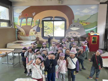 年中さんは温かな陽気に誘われて短大まで散歩に行きました。トトロに会えてうれしそうでした。