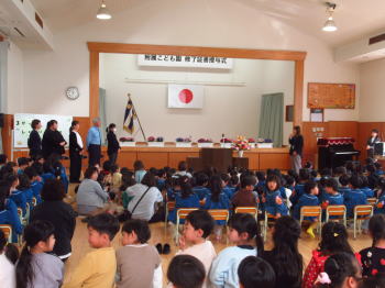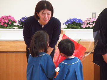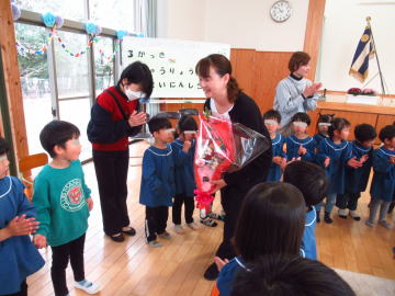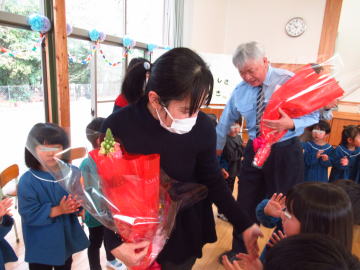 19日(木) 修了式がありました。普段は儀式的行事には参加しない未満児さんも退任式があるので参加しました。