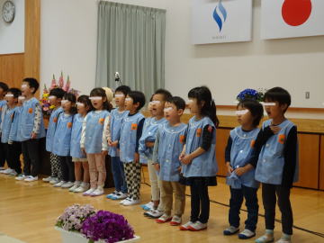 園からの歓迎の出し物では、まず年長さん代表が園歌などを歌ってお祝いの気持ちを表しました。