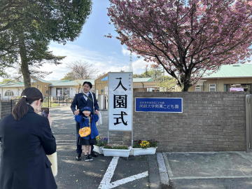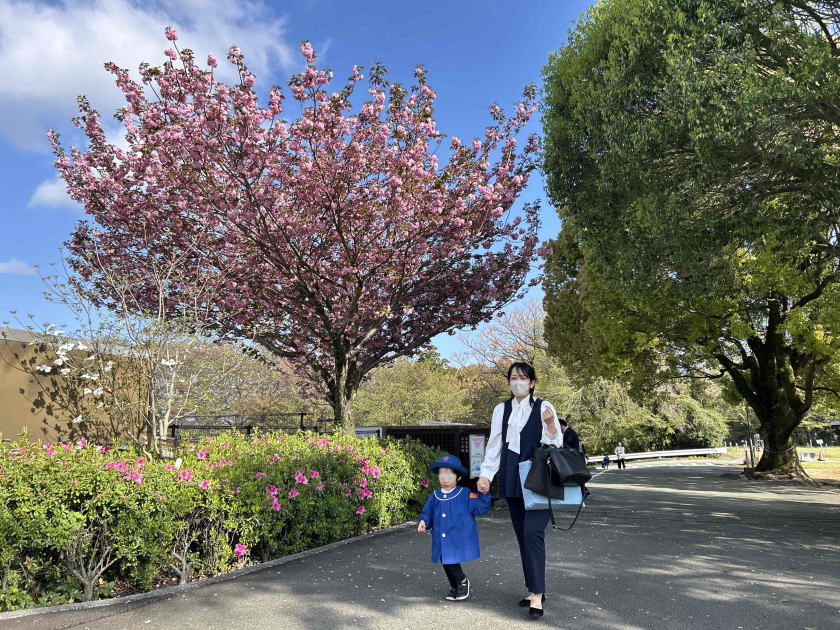 11日(土)こども園正門の八重桜が満開の中を、新入園児が登園してきました。
