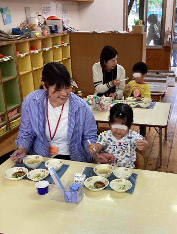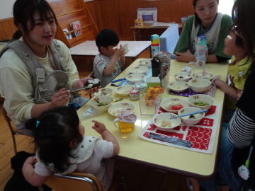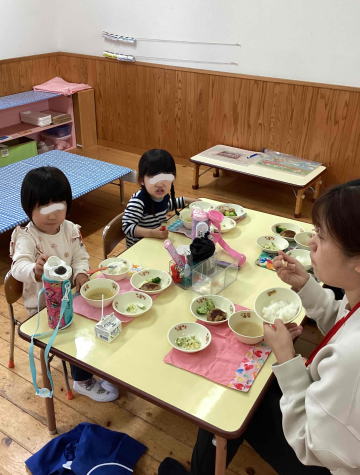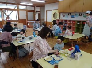 年少のおうちの方は園児と一緒に給食体験をしていただきました。14日(火)にご参加いただいた方はカレーライス等でした。