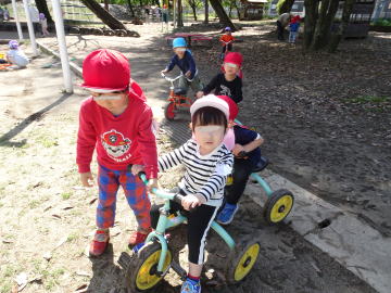 三輪車に乗っている年少さんが段差があるところで困っていました。すると年中さんが手伝ってくれました。