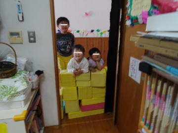園長室の扉を開けたらびっくり!積み木の壁ができていました。