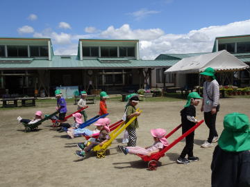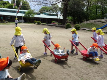 引き車の使い方を実際年長さんが引き役になって年少さんに教えていました。