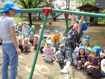 雲梯の使い方の見本を見せる年長さん。