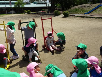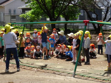 年長さんと年少さんがペアになって、年長さんから遊具などの遊び方の説明がありました。
