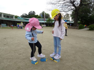 こちらは、お姉ちゃんにポックリの乗り方を教えてもらう年少さんです。