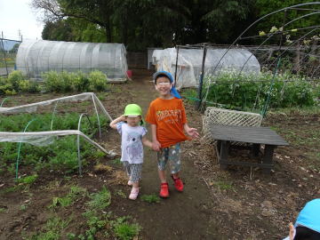 お兄ちゃんに手を引かれて畑の見学をする年少さんです。