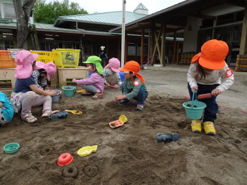 年少さんの色とりどりの帽子でにぎわう砂場の様子です。