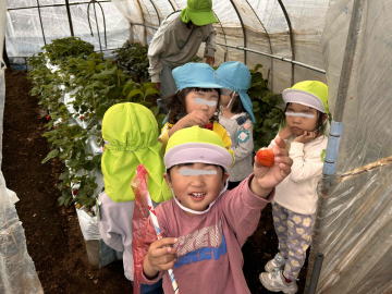 色づいたイチゴがたくさん実っています。先生と一緒にとって、一日のうち、一人1個食べることができます。毎日が「いちご狩り」です。