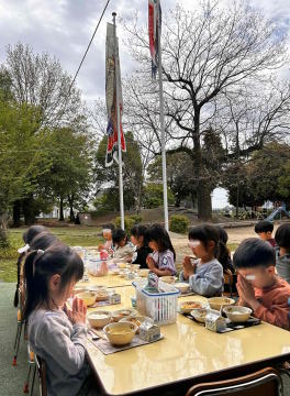 暑くも寒くもなく、気持ちの良い気候でした。こいのぼりに見守られながら、ベランダでの給食。「いただきます!」