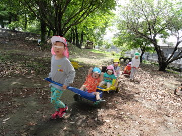 引き車に石を乗せて引いていました。重さを感じるのが楽しいのでしょうね。
