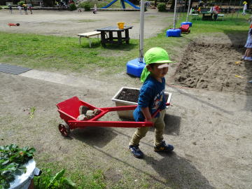 年少さんが砂をたらいに入れてかき混ぜていました。「なにを作っているの?」と尋ねたら、「なにも作ってない。」とのこと。かき混ぜることが楽しいのでしょう。