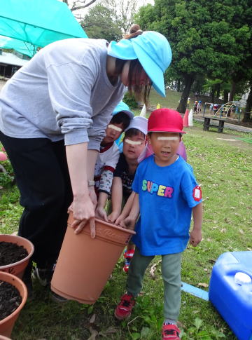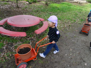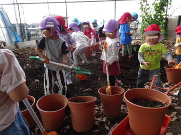 今日は収穫だけではありませんでした。自分の鉢に土を入れて…