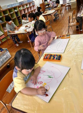 年少さんは、お絵かき帳・クレパスを初めて使いました。