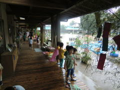 突然の大雨です。園児たちはテラスに出て、何事か!と驚いたり、手を出したり、体中ぬれてみたりしています。