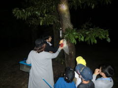 クヌギの木を中心に、根本から上の方までライトを照らして探しています。