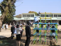 うんていで遊ぶわが子を見守る保護者。嬉しそうな園児。入園式を実施してよかったなあと感じます。